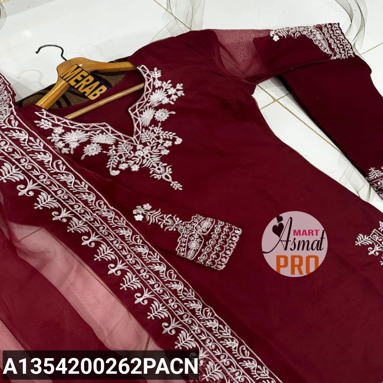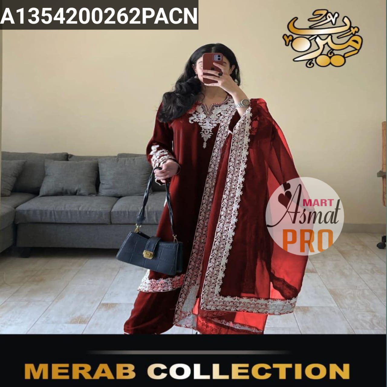 Make a statement with our stunning 3-piece women's embroidered suit, crafted in a beautiful maroon color. This exquisite ensemble features intricate embroidery on the neck, sleeves, and shirt border, adding a touch of luxury to the outfit. The dupatta boasts four-sided heavy embroidery, completing the look.